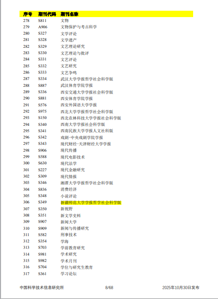 近日,中国科学技术信息研究所正式发布2025版中国科技核心期刊目录。本次目录分为学术卷与科普卷两大板块,其中学术卷收录期刊2693本,科普卷收录期刊52本。《新疆师范大学学报(哲学社会科学版)》再次入选,已连续十一年(2015—2025年)入选中国科技核心期刊目录。