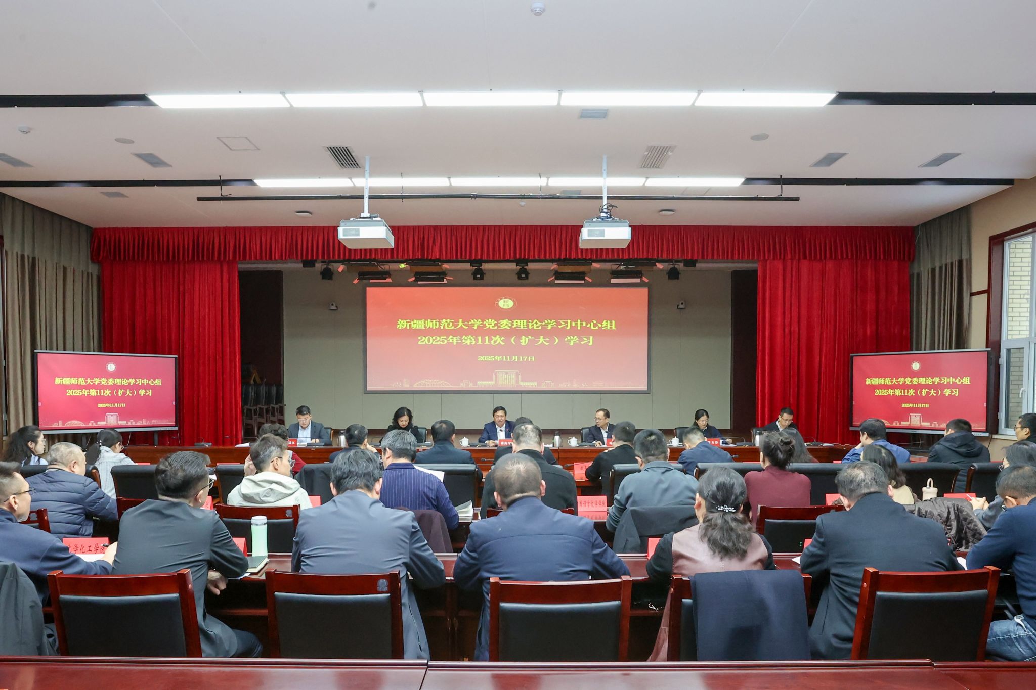 11月17日下午,校党委理论学习中心组在温泉校区行政楼220会议室召开2025年第11次(扩大)学习会议,深入学习领会党的二十届四中全会精神,系统把握习近平文化思想,深刻领悟习近平总书记关于意识形态工作、加强社会工作和提升社会治理效能的重要论述,切实把学习成果转化为推动学校高质量发展的强大动力。校党委书记蒋海军主持学习并讲话,校党委理论学习中心组全体成员参加学习。