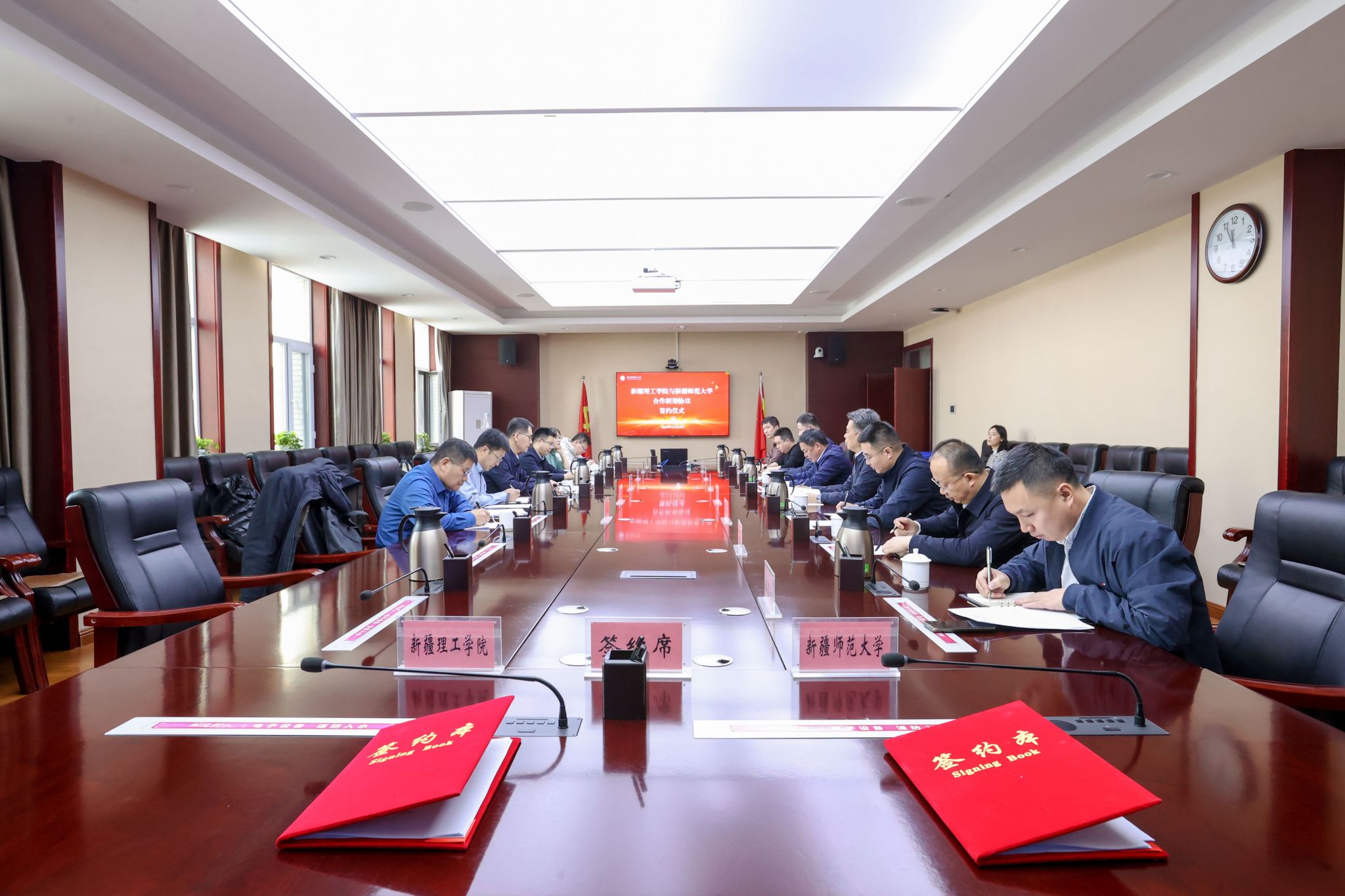 王世杰与王冬云分别作为双方代表签署协议。双方随后展开深入交流。王冬云表示,期望我校能够在新疆理工学院的教师博士学历提升、师资培养与发展、学科专业建设等方面给予更多的支持与帮助。王世杰强调,新疆地方高校若要实现跨越式发展,必须明确办学定位、办学方向及办学特色,细化领域分工并做好前瞻性布局,走独具特色的发展道路,避免同质化竞争,积极寻求差异化发展。新疆理工学院与会代表分别就联合申报国家级教学成果奖、共建教师发展中心联盟、留学生管理与人才培养、兼职硕导互聘机制、教师学历提升计划以及联合科研合作等方面提出了具体合作需求。