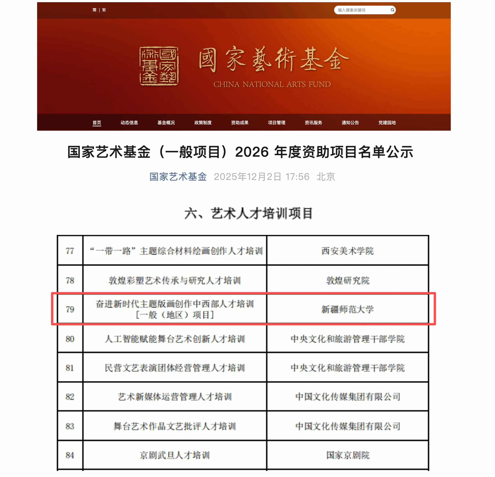 近日,国家艺术基金(一般项目)2026年度资助项目公示名单发布,我校成功立项艺术人才培训项目1项、青年艺术创作人才项目1项,较往年取得明显突破。