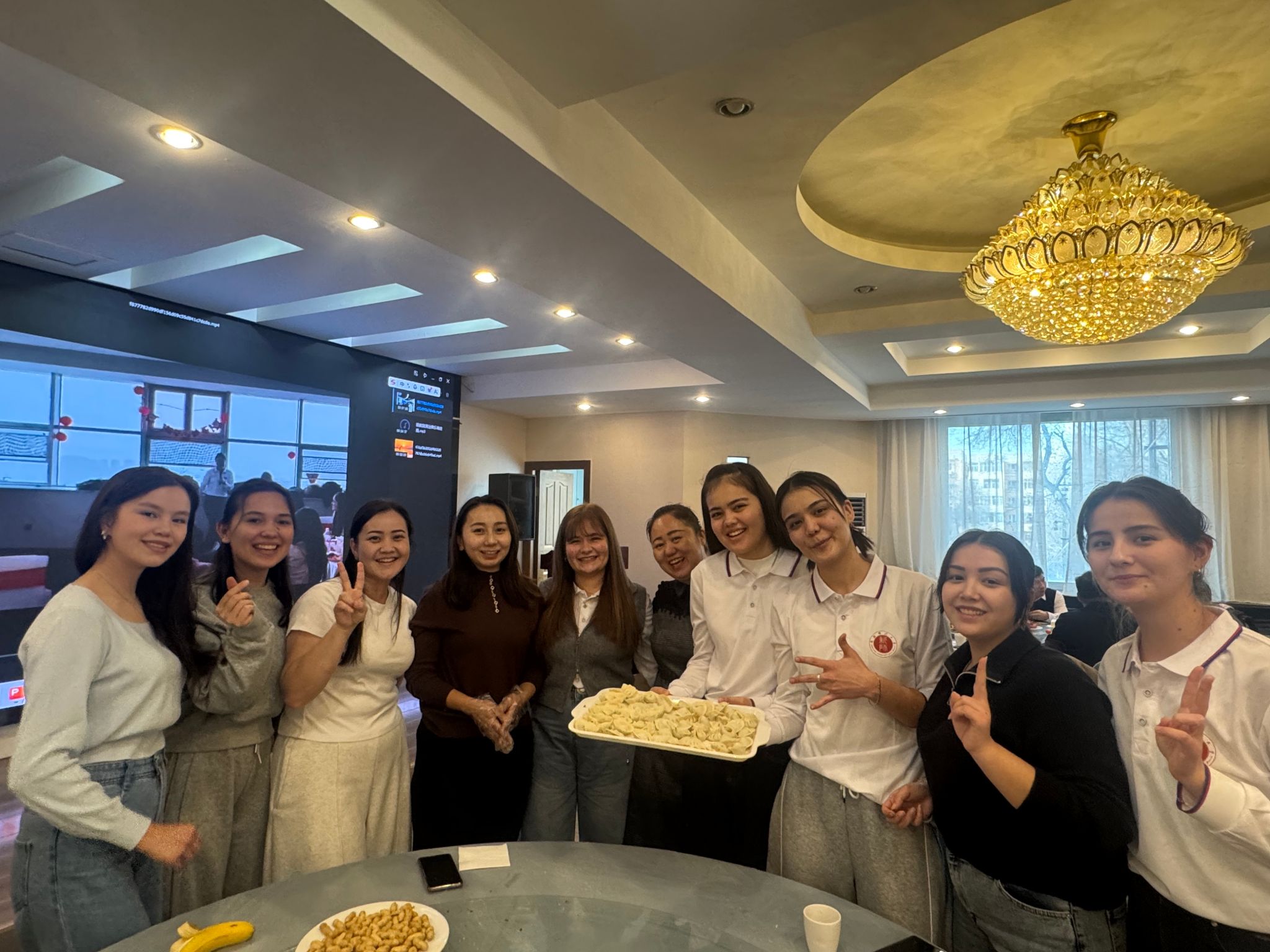 在“品味中国年”包饺子体验环节,蒋海军与留学生们围坐在一起包饺子,并亲身示范包制方法。现场欢声笑语不断,洋溢着喜庆祥和的节日氛围。留学生们纷纷用中文表达对中国文化和春节的喜爱之情,并对学校的关心慰问表示感谢。活动期间,蒋海军、蒋方珍还向留校留学生发放了慰问品,并与大家合影留念。