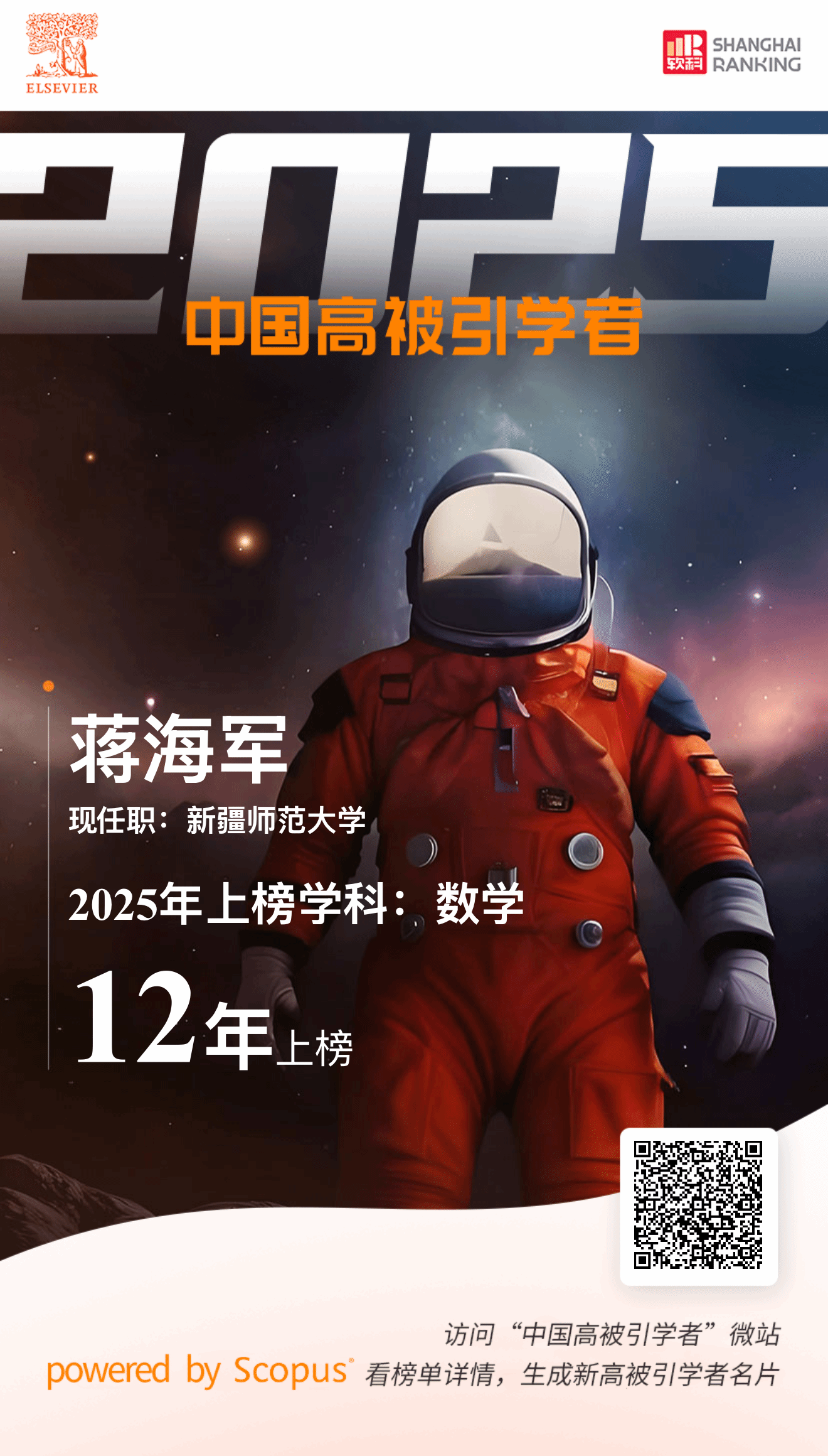 近日,全球著名出版集团爱思唯尔(Elsevier)发布2025“中国高被引学者”(Highly Cited Chinese Researchers)榜单,我校蒋海军教授入选“数学”领域高被引学者榜单,已连续十二年蝉联该榜单。
