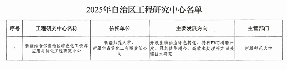 近日,自治区发展和改革委员会发布《自治区发展改革委关于2025年度自治区工程研究中心的批复》,我校化学化工学院与新疆华泰重化工有限责任公司联合申报的“新疆维吾尔自治区特色化工资源应用与转化工程研究中心”成功获批。这是学校获批的首个自治区工程研究中心,标志着我校在科技创新平台建设领域取得的重大突破。