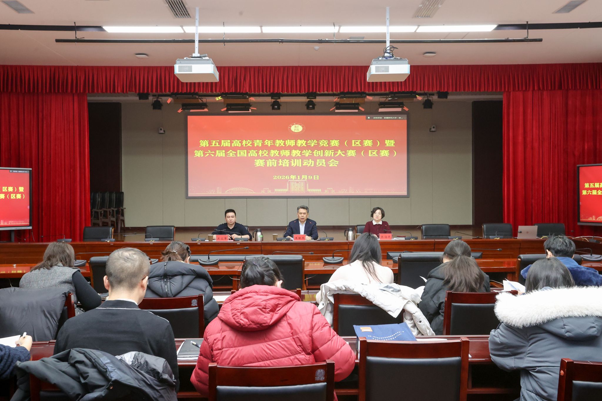 为进一步提升我校教师教学能力,凝聚备赛共识,提升参赛竞争力,助力我校教师在区赛中取得优异成绩,1月9日,我校在温泉校区行政楼220会议室举办第五届高校青年教师教学竞赛(区赛)暨第六届全国高校教师教学创新大赛(区赛)赛前培训动员会。校党委常委、副校长王世杰参加会议并讲话,学校党委教师工作部副部长、教务处处长关文军,往届教创赛、青教赛获奖教师代表,以及两项赛事校赛全体参赛教师及团队成员参加会议。会议由学校党委教师工作部部长张海燕主持。