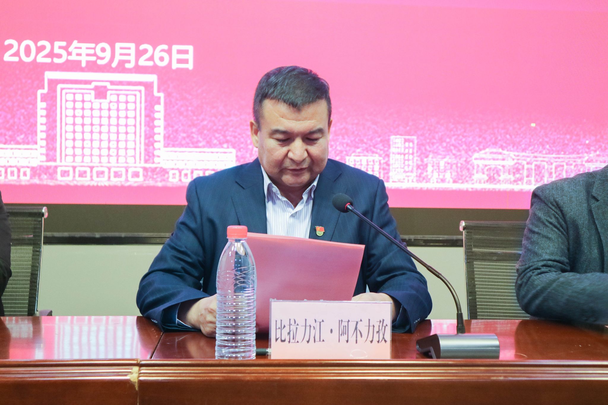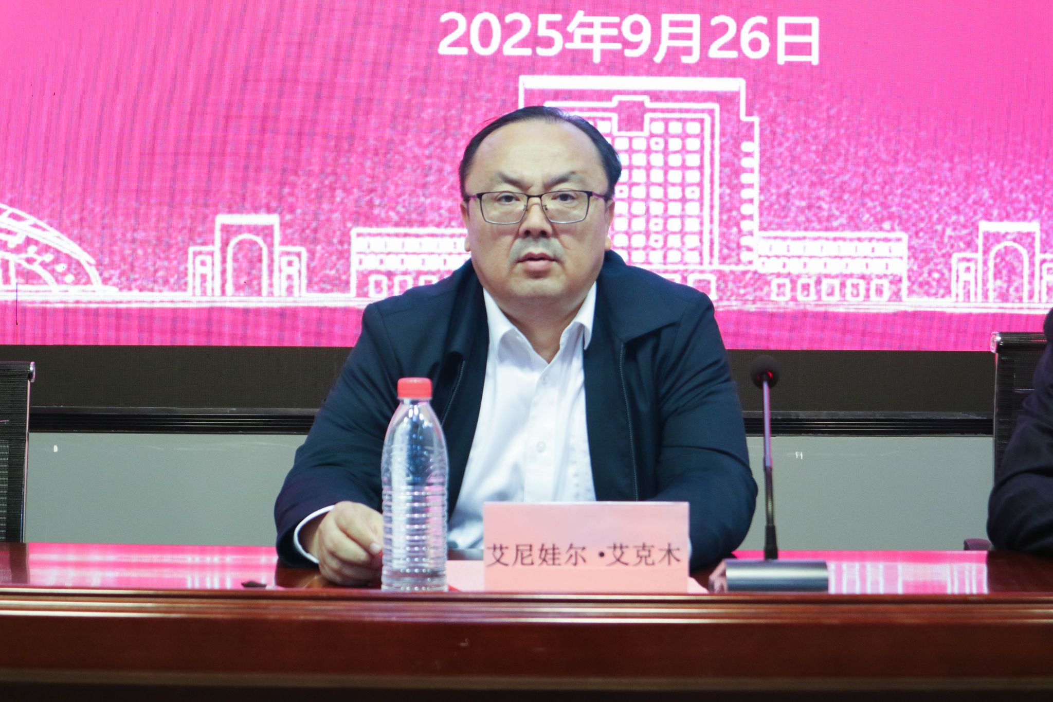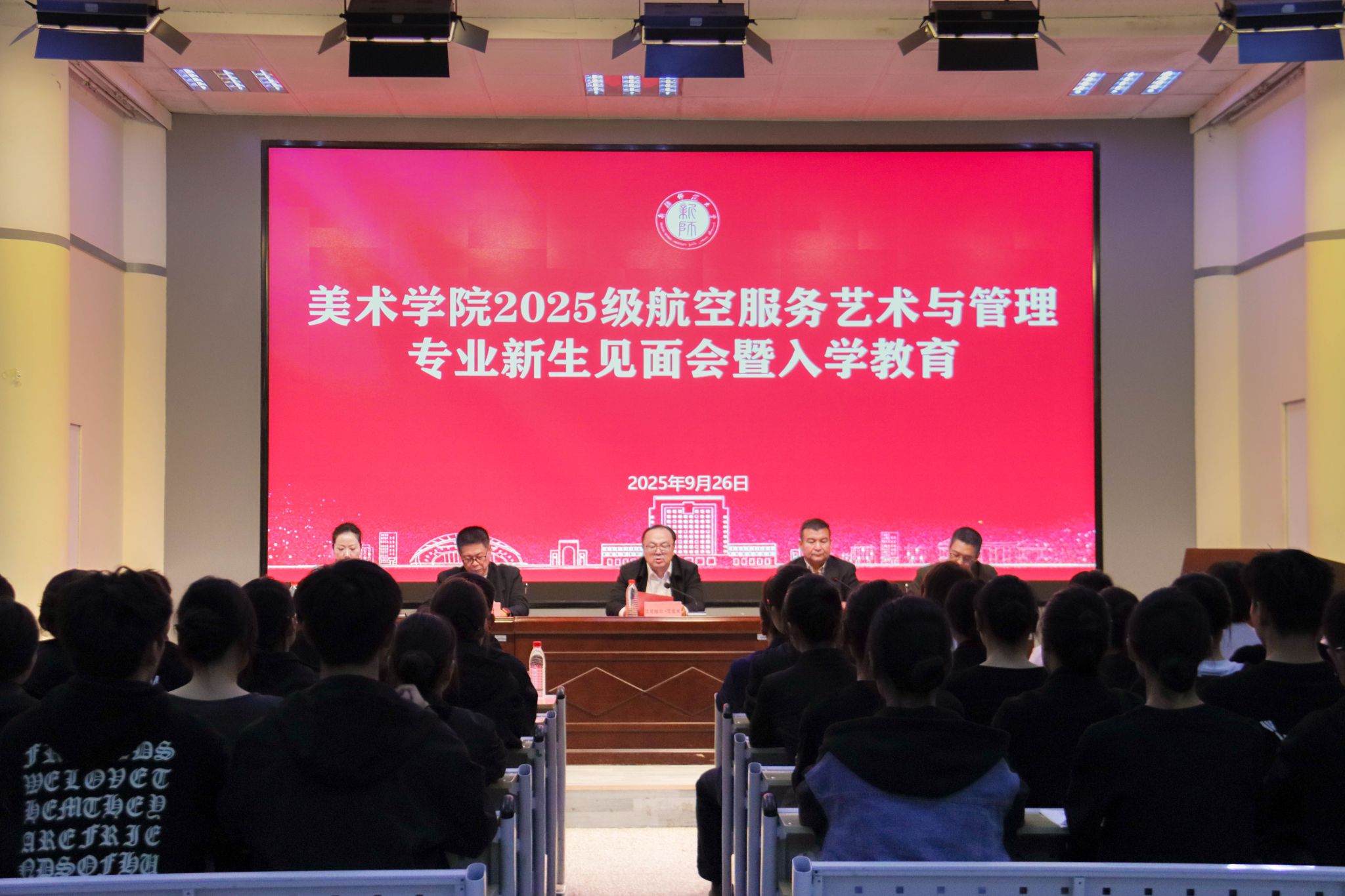 9月26日,我校美术学院举行2025级航空服务艺术与管理专业新生见面会暨入学教育。校党委副书记、校长艾尼娃尔·艾克木参加会议。教务处副处长毋兆鹏、美术学院领导班子成员、广慧金通教育集团新疆区副总经理张海燕和187名新生参加见面会,见面会由我校美术学院党委书记比拉力江·阿不力孜主持。