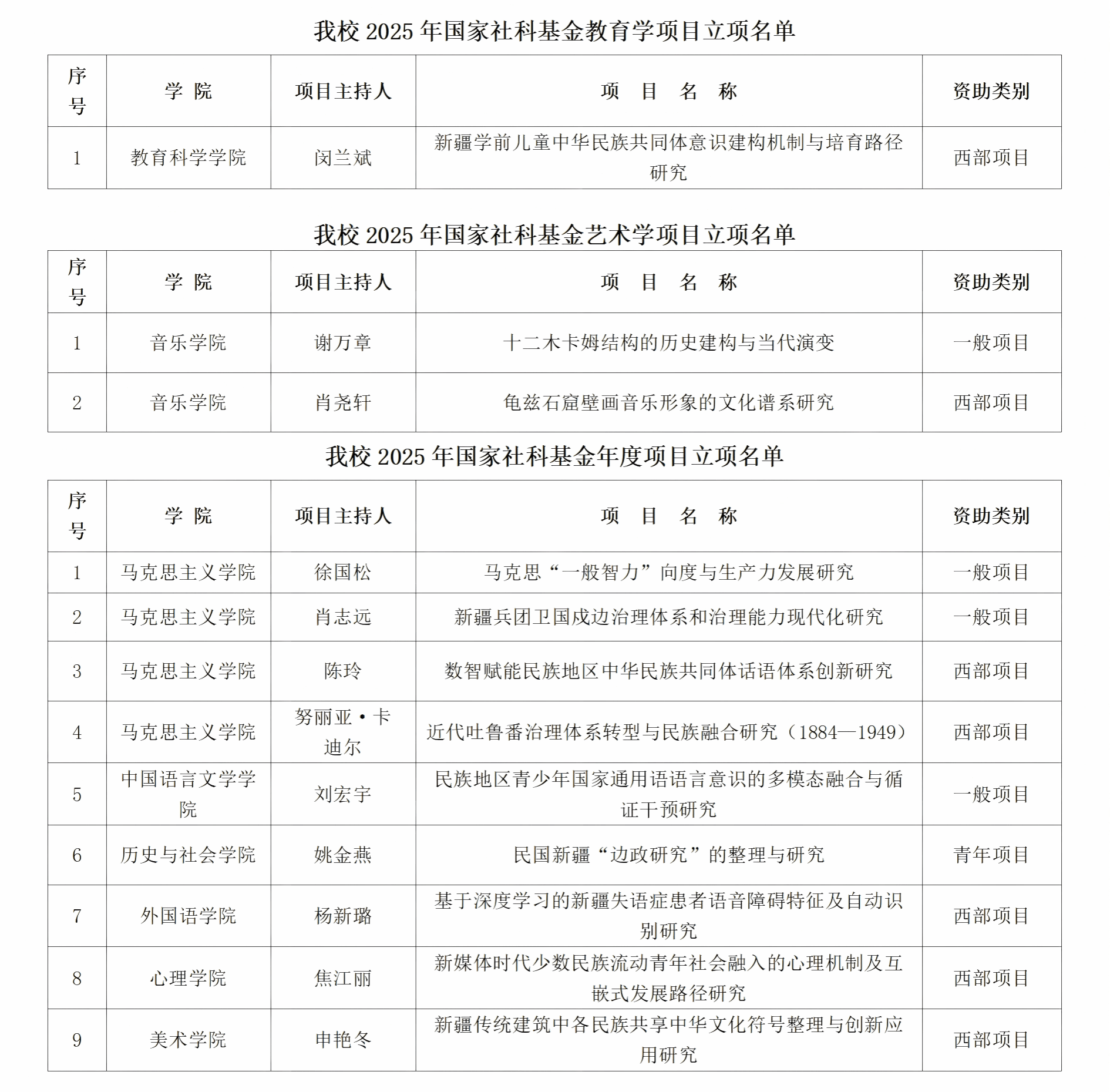 近日,2025年国家社科基金教育学、艺术学和年度项目立项名单陆续公布,我校共立项12项,其中国家社科教育学项目1项,艺术学项目2项,年度项目9项,立项总数在区内各高校中排名前列。