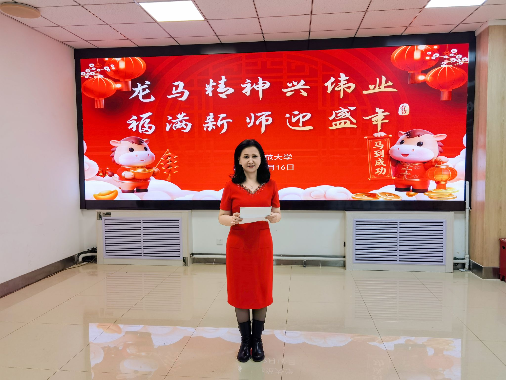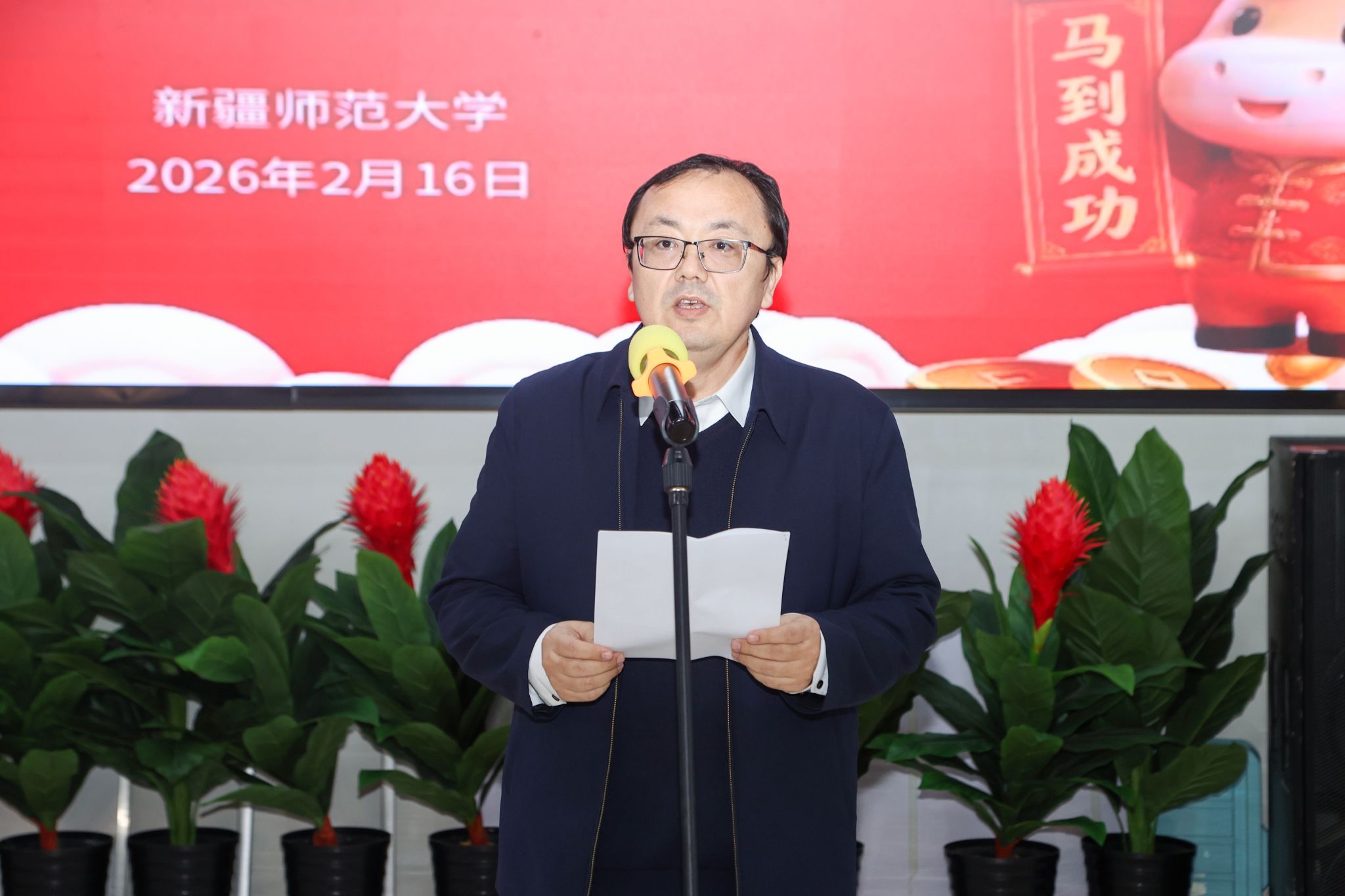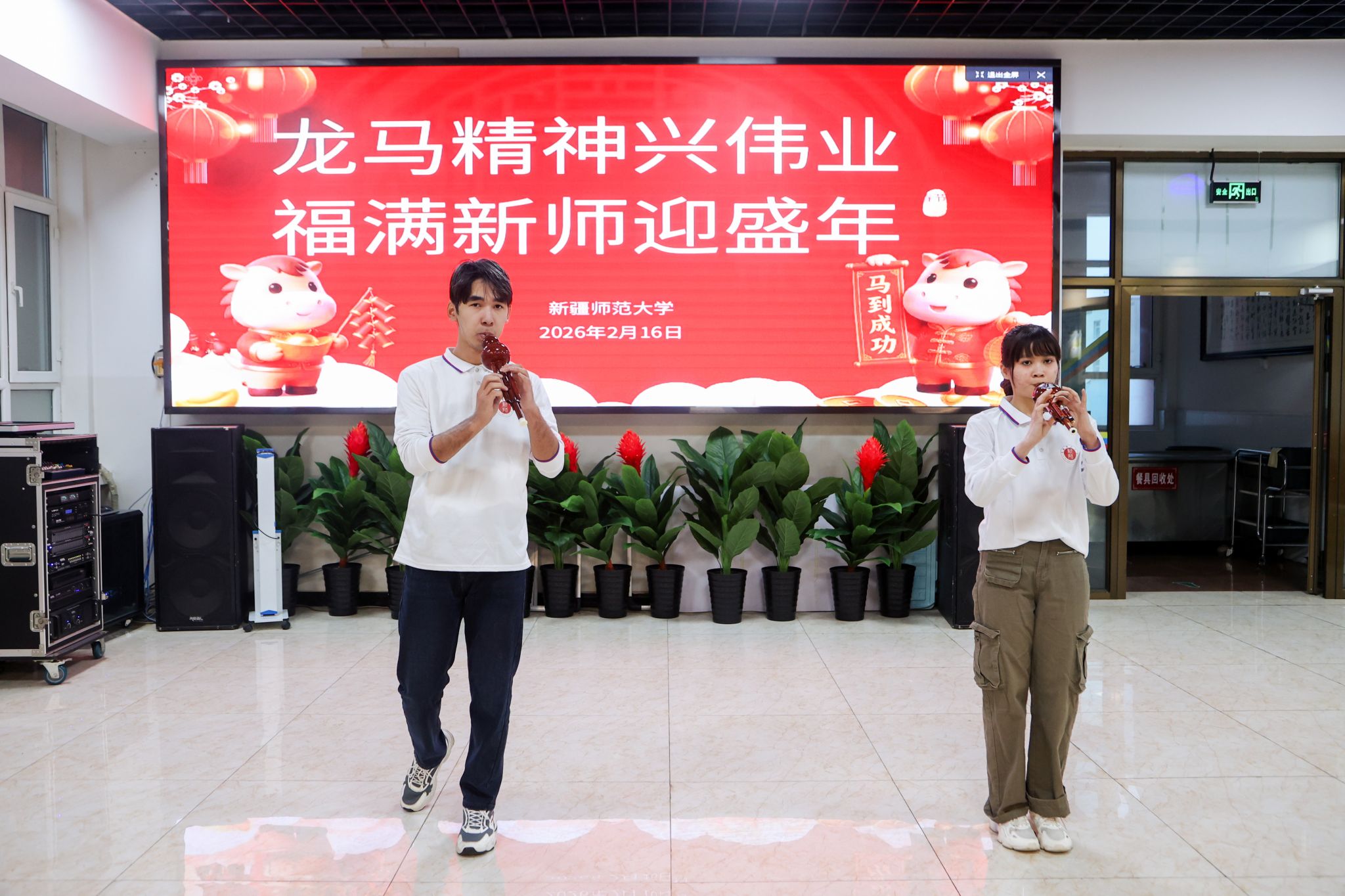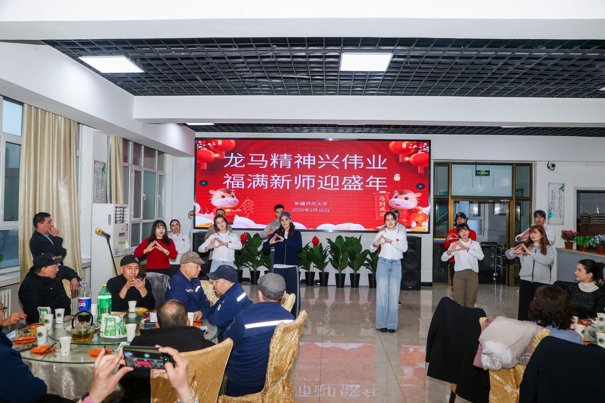 金马贺岁,万象更新。2月16日除夕夜,我校昆仑校区、温泉校区教职工餐厅内张灯结彩、笑语欢声,“龙马精神兴伟业 福满新师迎盛年”2026年寒假留校师生迎新春联谊活动温情启幕。校党委副书记、校长艾尼娃尔·艾克木出席昆仑校区活动,校党委常委、副校长帕提曼·吐尔逊出席温泉校区活动,与节日期间坚守岗位的教职员工、留校过年的中外学子共度除夕,同迎丙午马年新春。